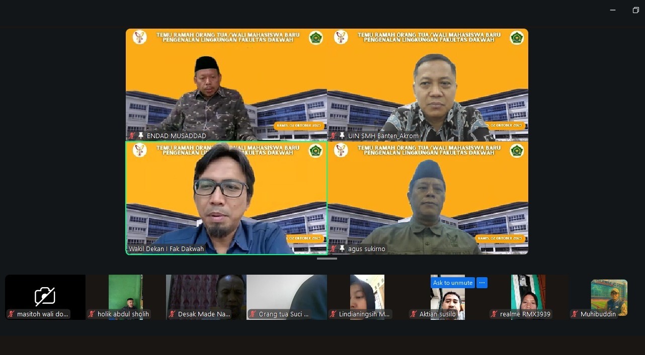 SERANG, Fakultas Dakwah Universitas Islam Negeri (UIN) Sultan Maulana Hasanuddin Banten menggelar temu ramah virtual dengan orang tua/wali mahasiswa baru, Kamis (2/10/2025). Kegiatan ini bertujuan untuk menjalin sinergi antara pihak kampus dan keluarga dalam mewujudkan pendidikan yang berkualitas dan unggul bagi mahasiswa. Kegiatan berlangsung secara virtual melalui platform Zoom, acara ini dihadiri oleh ratusan orang...Read More
